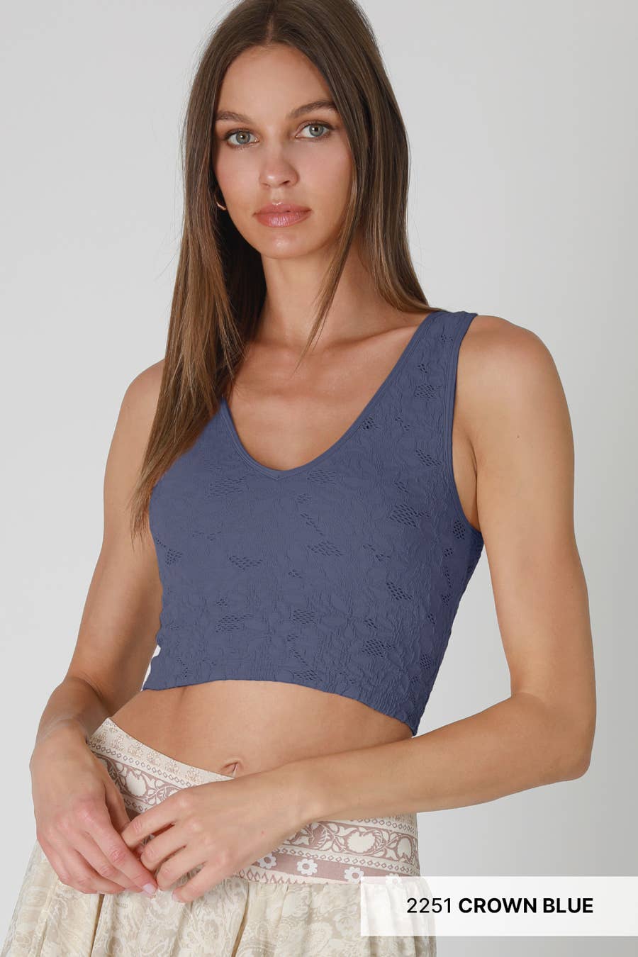 This eye-catching top features a V neckline, creating a delicate and feminine look. Intricate lace pattern adds a layer of texture and depth, while the crop cut offers a contemporary flair.