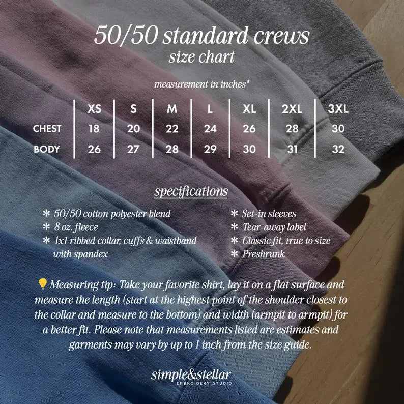 Embroidered on 50/50 cotton/polyester blend sweatshirts.